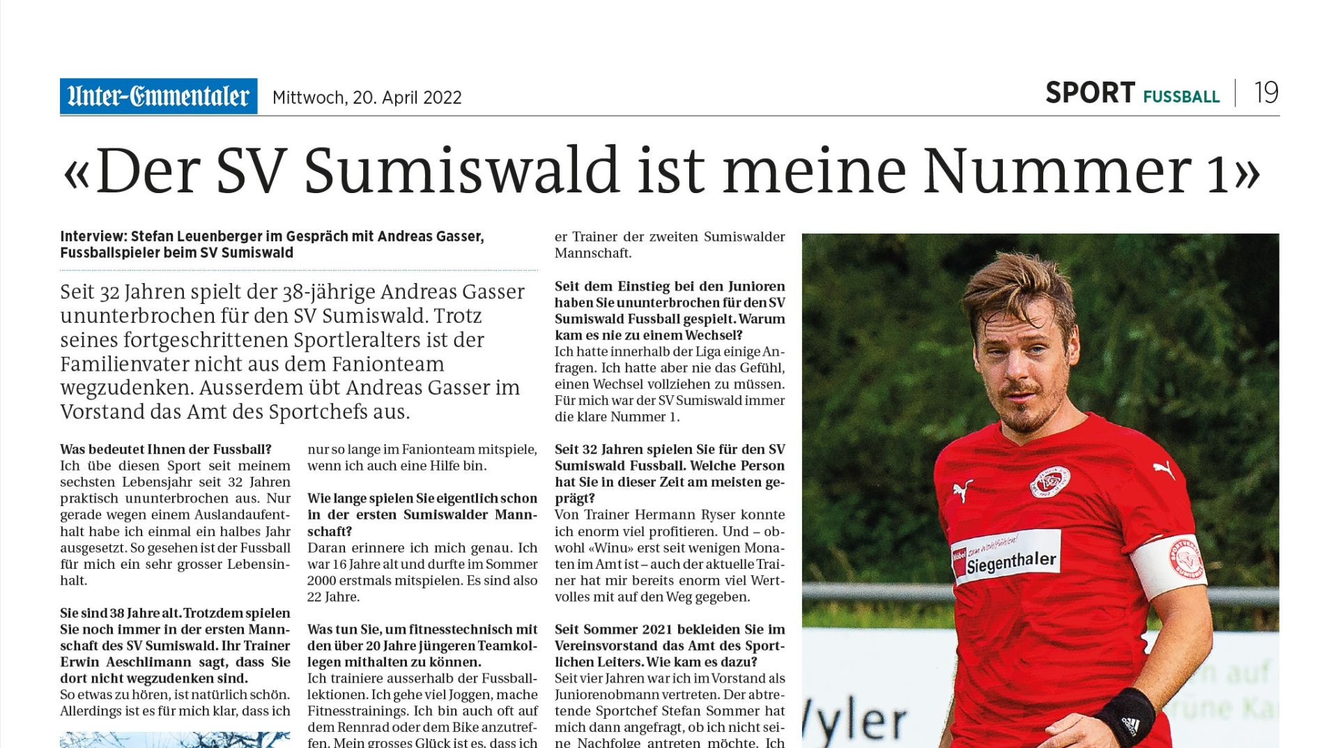 Seit 32 Jahren spielt der 38-jährige Andreas Gasser ununterbrochen für den SV Sumiswald. Trotz seines fortgeschrittenen Sportleralters ist der Familienvater nicht aus dem Fanionteam wegzudenken. Ausserdem übt Andreas Gasser im Vorstand das Amt des Sportchefs aus.